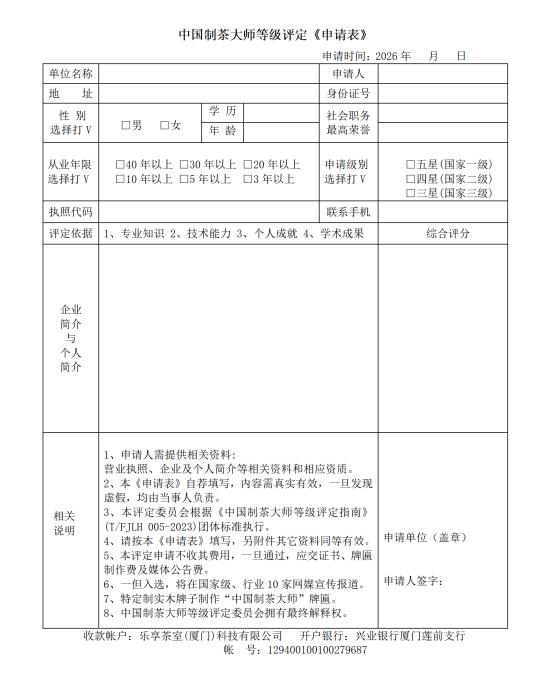 友情提示:一旦申报通过,将聘任为中国制茶大师等级评定委员会“国茶智库”专家成员。