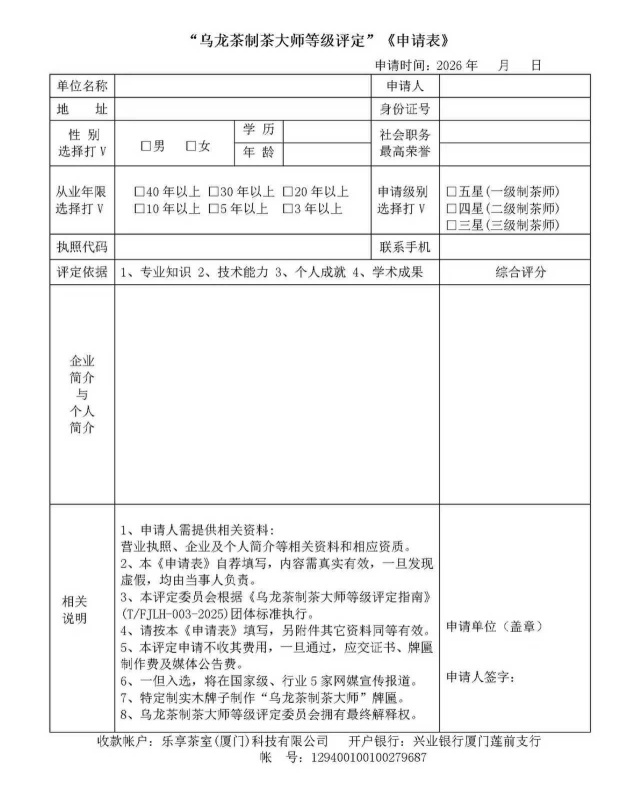 友情提示:一旦申报通过,将聘任为北京中科国茶农业科学研究院、乌龙茶制茶大师等级评定委员会“国茶智库”专家委员,任期五年。
