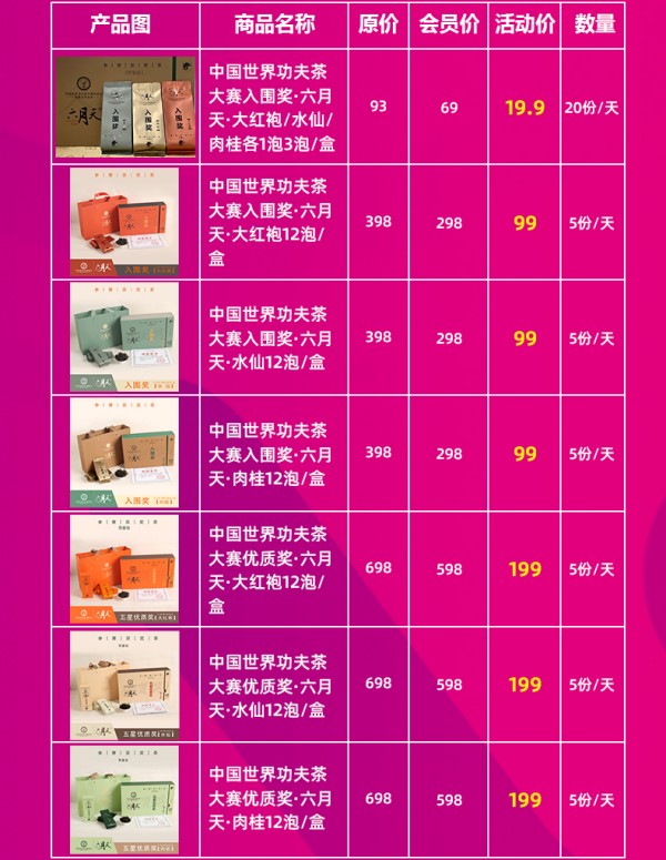 活动时间:即日起至2022年12月30日止。活动内容如下:中国世界功夫茶大赛入围奖•六月天·大红袍/水仙/肉桂各1泡 3泡/盒 原价:93,会员价:69,活动价:19.9 数量:20份/天;