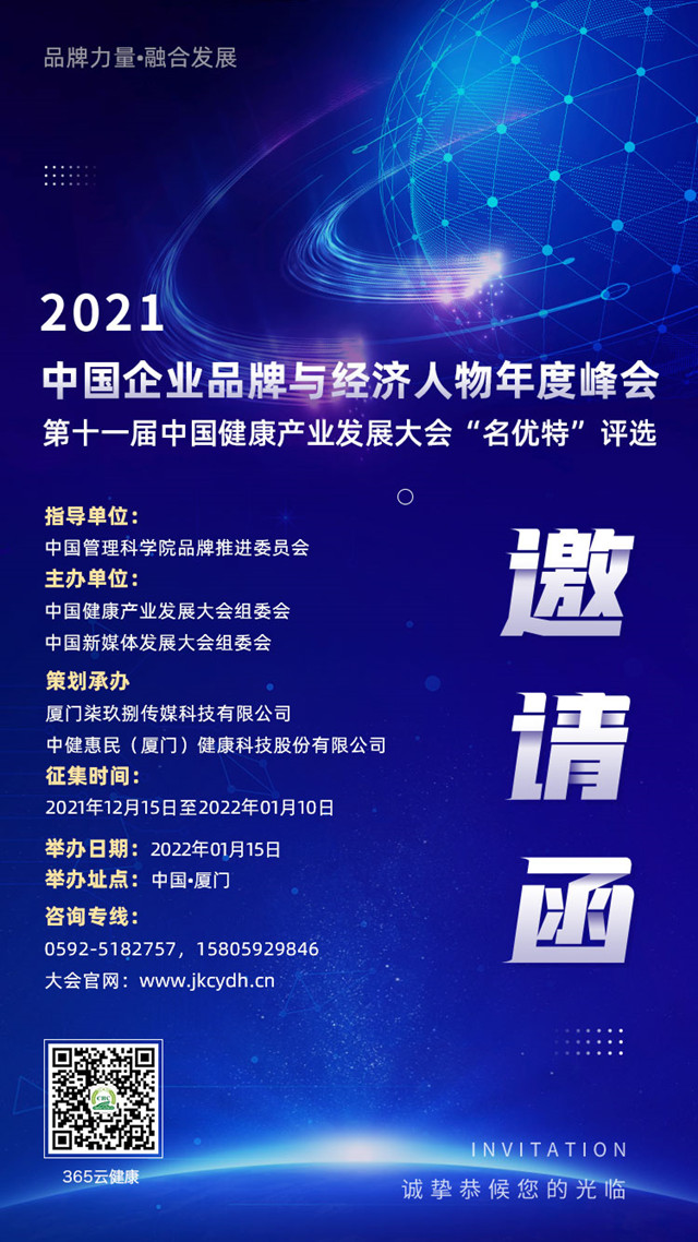 敬请关注!2021中国企业品牌与经济人物年度峰会暨第十一届中国健康产业发展大会“名优特”评选全国展开征募!颁奖盛典与年度峰会将于2022年01月15日在厦门召开。