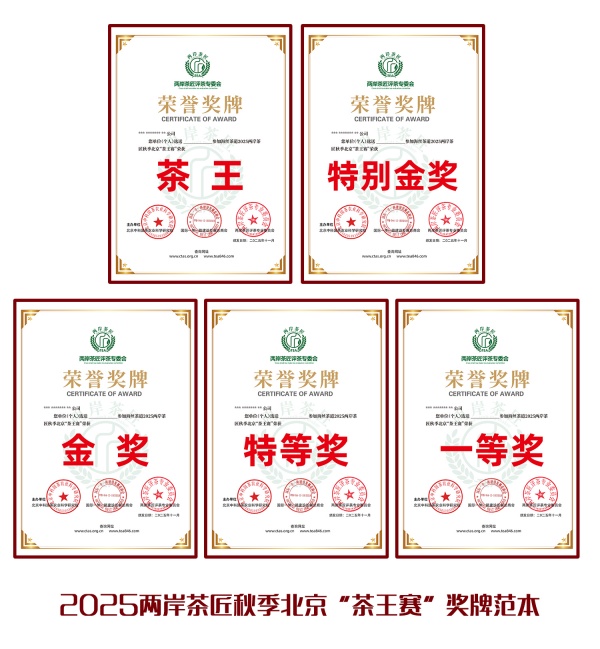 5、奖项设置:每款茶品以50个茶样为基础,设置奖项茶王1名、金奖(特别金奖)4名、特等奖6名、一等奖数名(评委会可根据实际情况调整奖项增减),获得者颁发《荣誉证书》,需制作牌匾、参会自愿另付费用。
