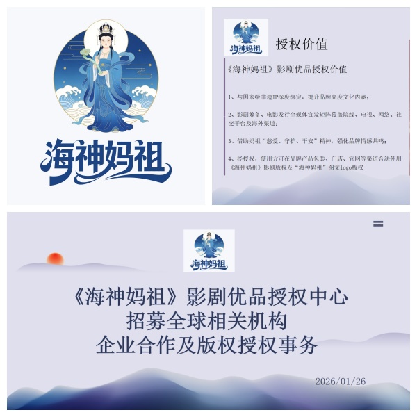 《海神妈祖》影剧优品授权中心招募全球相关企业为品牌、产品宣传、推广、形象传播代言等使用。
