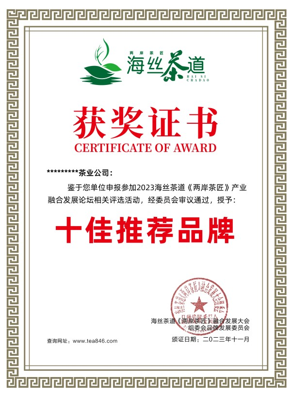 3、推荐参与“品牌企业”评选采取企业自荐和行业社团、相关部门推荐参评方式,拟定名称:2023十大名牌、十佳行业标杆、十佳生态基地、十佳创新模式、十佳特色工艺、十佳诚信企业、十佳健康养生茶、十佳绿色茶园及十佳工匠大师、优秀企业家等企业品牌与经济人物。