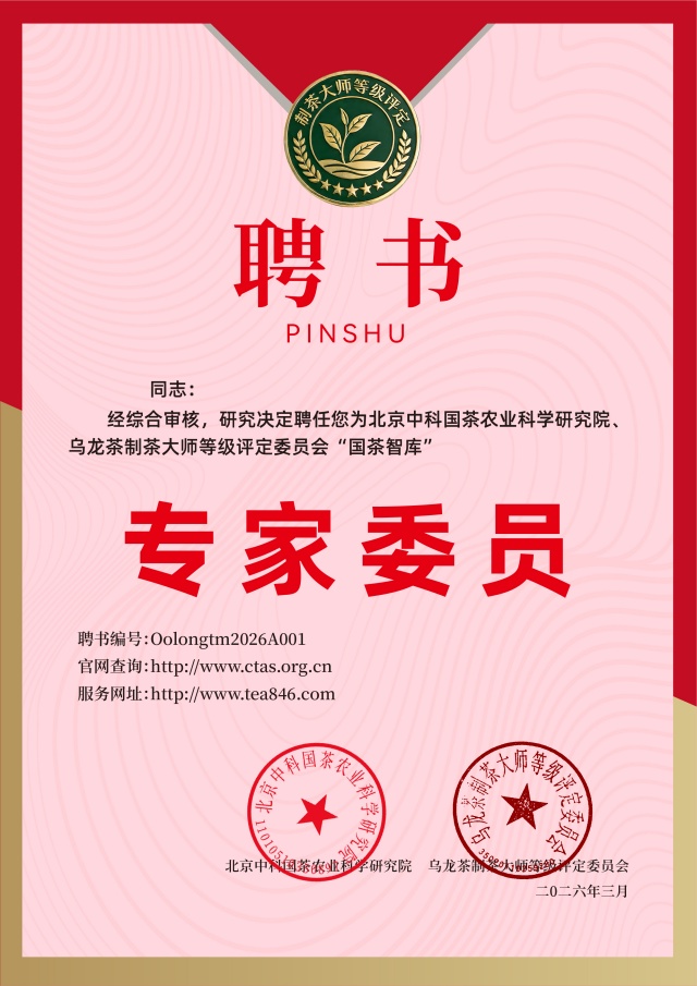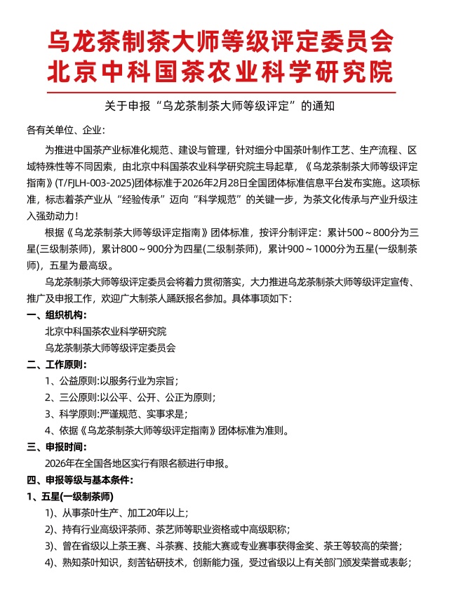 友情提示:一旦申报通过,将聘任为北京中科国茶农业科学研究院、乌龙茶制茶大师等级评定委员会“国茶智库”专家委员,任期五年。
