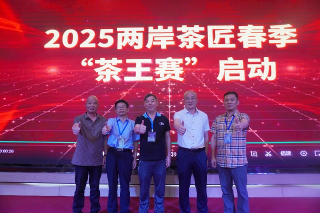 图为蔡志清会长、郑培植总会长、黄玉林校长、谢永刚处长、卢劲主任共同开启2025两岸茶匠春季“茶王赛”启动仪式。