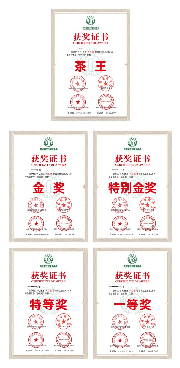 5、每款茶品以50个茶样为基础,设置奖项为茶王1名、金奖2名、特等奖5名、一等奖数名(组委会可根据实际送样数量、品质酌情调整奖项增或减),获得者颁发大赛组委会《荣誉证书》,需奖牌、参会自愿另付费用。