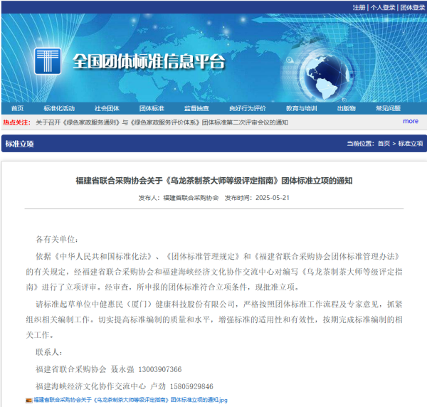 3、《乌龙茶制茶大师等级评定指南》团体标准已立项,获奖较高有机会可以申请《参编单位》及起草人。
