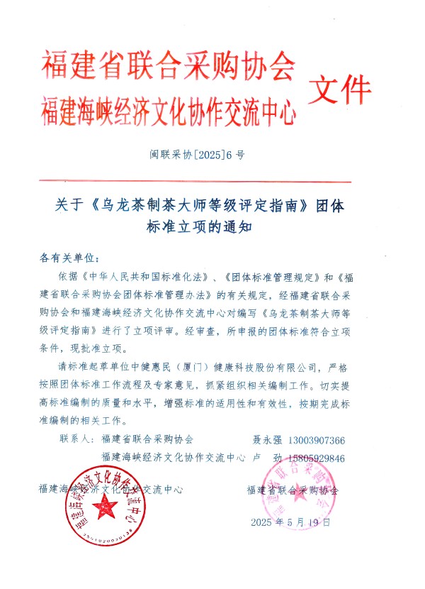 为推进中国茶产业标准化规范、建设与管理,为细分中国茶行业制作工艺、生产流程、区域特殊性等不同因索,由中健惠民(厦门)健康科技股份有限公司提岀,北京中科国茶农业科学研究院、乐享茶室(厦门)科技有限公司等单位发起,福建省联合釆购协会、福建海峡经济文化协作交流中心归口,《乌龙茶制茶大师等级评定指南》团体标准于2025年5月21日获准立项。