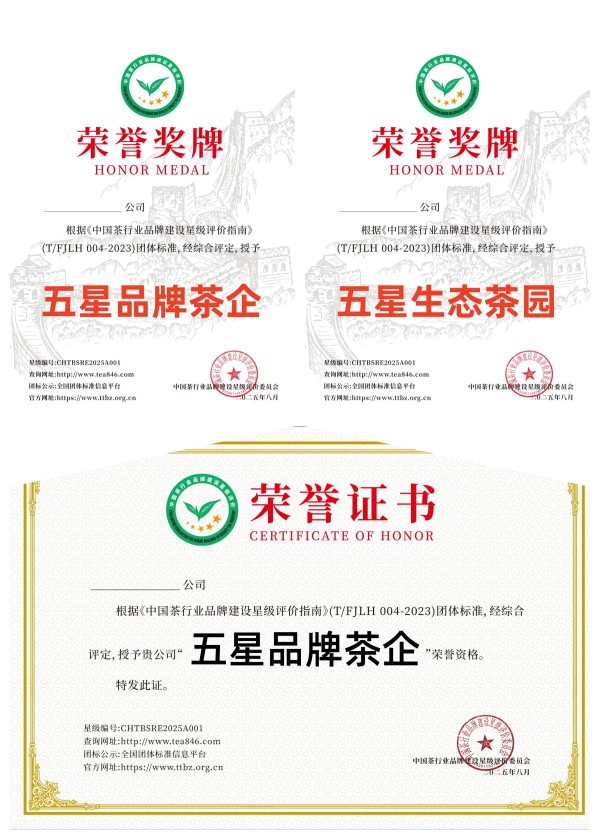 2、中国茶行业品牌建设星级评价“星级品牌茶企”、“五星生态茶园”评审认定启动!为进一步推动茶产业的标准化、规范化、品牌化发展,提升茶企知名度和影响力,推进优秀茶企品牌升值,引领星级品牌茶业国际化进展,全面落实全国团体标准信息平台2024年10月21日《中国茶行业品牌建设星级评价指南》(T/FJLH004-2023)团体标准,中国茶行业品牌建设星级评价委员会将全面拓展2025年“星级品牌茶企”、“五级生态茶园”等茶行业五星、四星、三星评审认定工作,欢迎优秀茶企、著名品牌申报参加。
