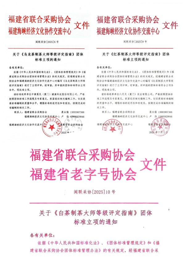 二、乌龙茶、红茶、白茶制茶大师等级评定已获准立项,全面征集!为更好明确乌龙茶、红茶、白茶制茶大师等级评定的标准化,推动制茶做茶、生产工艺、技术人才标准化管理与等级评定,由北京中科国茶农业科学研究院、六月天(厦门)实业有限公司,中健惠民(厦门)健康科技股份有限公司、乐享茶室(厦门)科技有限公司、厦门柒玖捌传播科技有限公司等单位提岀与起草,福建省联合采购协会、福建海峡经济文化协作交流中心、福建省老字号协会归口,《白茶制茶大师等级评定指南》团体标准于2025年7月31日、《红茶制茶大师等级评定指南》于2025年7月3日、《乌龙茶茶制茶大师等级评定指南》于2025年4月21日分别获准立项。