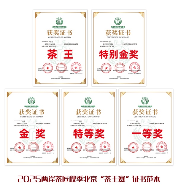 每款茶品以50个茶样为基础,设置奖项茶王1名、金奖(特别金奖)4名、特等奖6名、一等奖数名(评委会可根据实际情况调整奖项增减),获得者颁发《荣誉证书》,需制作牌匾、参会自愿另付费用。