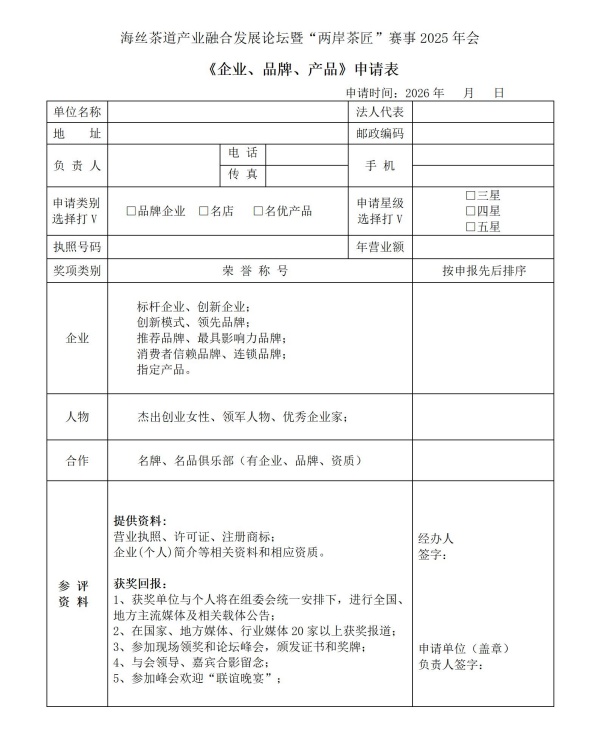 1、第一届至第六届两岸茶匠“茶王赛”、2025“民族品牌”国际茶叶品鉴大赛获奖企业和个人自愿报名,免费参会;