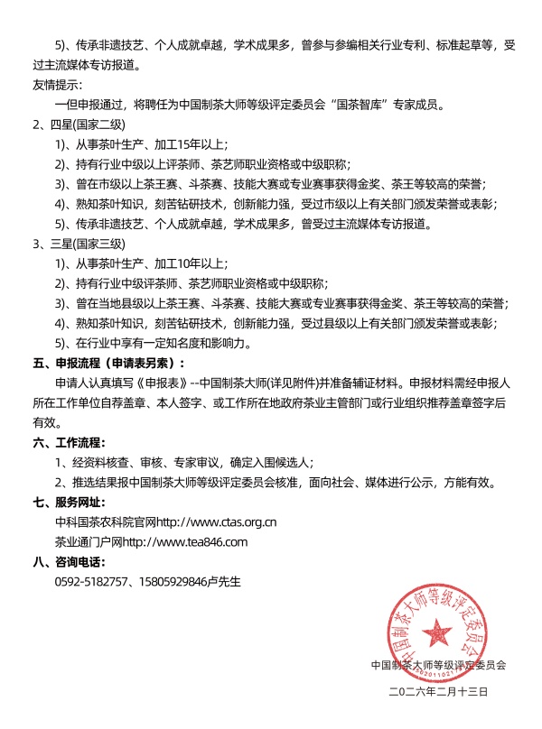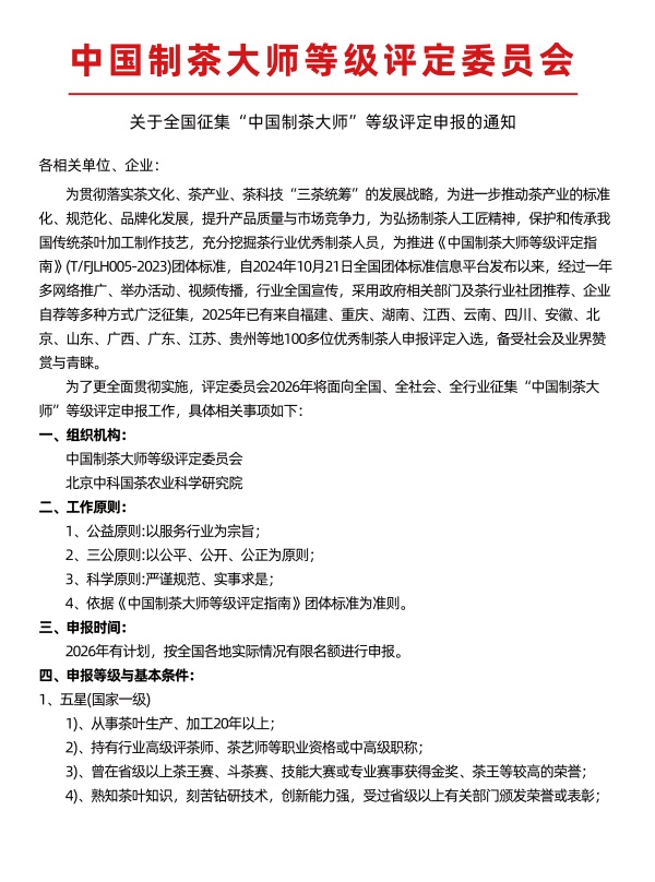 为了更全面贯彻实施,评定委员会2026年将面向全国、全社会、全行业征集“中国制茶大师”等级评定申报工作,具体相关事项如下: