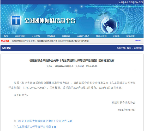 值此新春伊始、万物复苏之际,中国茶产业迎来一场崭新的“开门红”!《乌龙茶制茶大师等级评定指南》(T/FJLH-003-2025)团体标准于2026年2月28日全国团体标准信息平台发布,2月15日实施。这一成果,标志着茶产业从“经验传承”迈向“科学规范”的关键一步,为茶文化传承与产业升级注入强劲动能!